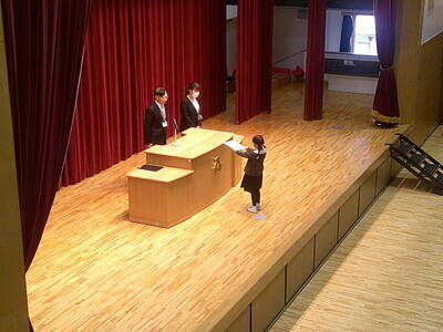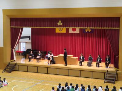 今日は体育館で開校記念朝会を行いました。
