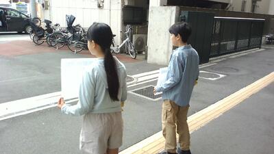 2年生が1年生を案内して、1年生は校内に何があるかを探しました。