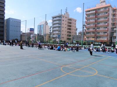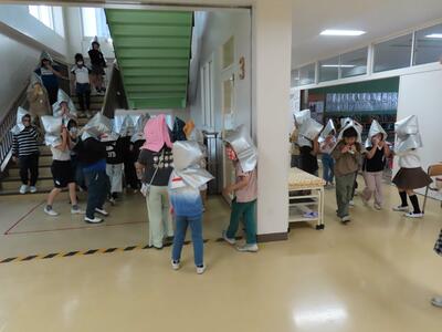 本日、地震から6階の家庭科室で火災が発生したという想定で避難訓練を行いました。火災時は煙を吸わないようにハンカチで口をおさえることや、落ち着いて行動することが大切です。子どもたちは放送をよく聞き、先生の指示に従って、落ち着いて避難することができました。高い階からの避難という難しい状況でも、「お・か・し・も・ち」の約束を守って真剣に取り組む姿が印象的でした。今後も、いざというときに自分の命を守れるよう、訓練を重ねていきたいと思います。