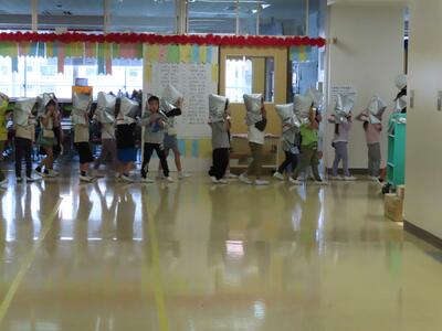 今日、1年生を迎える会が行われました。進行や準備は子どもたちが主体となって行い、上級生を中心に、みんなで心を込めて1年生を迎える姿が印象的でした。各学年の発表では、歌や言葉、工夫をこらした出し物が続き、1年生も笑顔いっぱいで楽しんでいました。会の終盤には、2年生からの贈り物が渡され、1年生からは元気いっぱいの歌の発表がありました。学校全体があたたかな雰囲気に包まれた、すてきな時間となりました。
